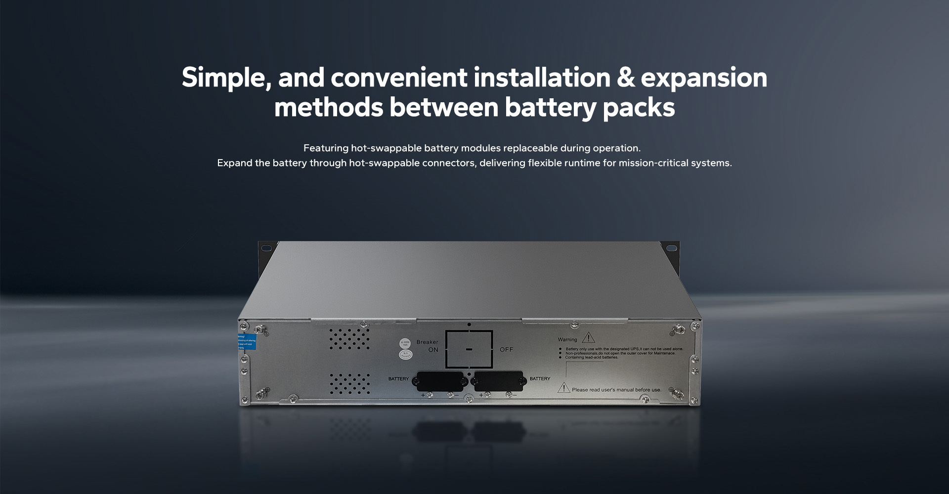 • Modular design, easy for expansion, Extend backup time by adding more battery pack